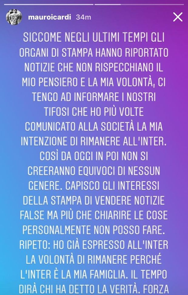 Ciò nonostante, l'ex Sampdoria potrebbe continuare la sua avventura in quel di Milano. Sì, perché Icardi ha scelto i social per chiarire una volta per tutta la propria posizione in merito al suo destino calcistico.