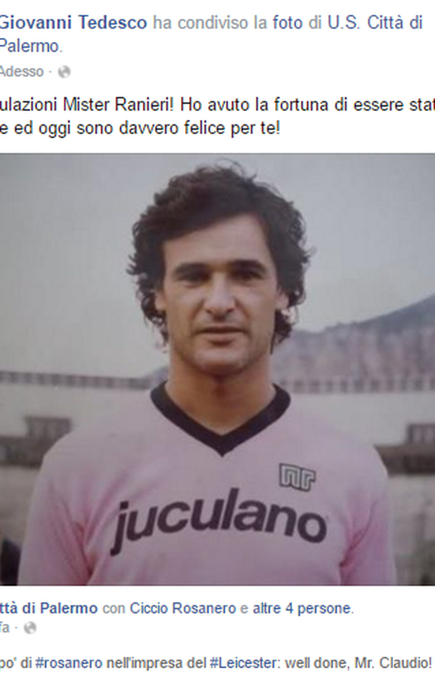 Ventitré anni dopo, il messaggio di Tedesco all'uomo copertina del momento. "Congratulazioni, Mister Ranieri! Ho avuto la fortuna di essere stato un tuo giocatore ed oggi sono davvero felice per te!", ha scritto sulla propria pagina Fecebook, l'ex collaboratore tattico di Iachini e Novellino sulla panchina del Palermo.