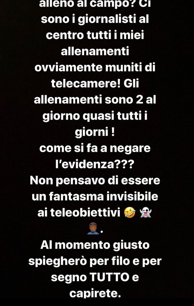 "Ma come fate a scrivere che non mi alleno al campo? Ci sono i giornalisti al centro a tutti i miei allenamenti, ovviamente minuti di telecamere! Gli allenamenti sono due al giorno, quasi tutti i giorni! Come si fa a negare l'evidenza? Non pensavo di essere un fantasma invisibile ai teleobiettivi. Al momento giusto spiegherò per filo e per segno tutto e capirete".