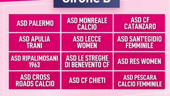 GIRONE D: Palermo, Monreale, Salento Women, Catanzaro, Apulia Trani, Sant'Egidio Femminile, Ripalimosani, Le Streghe Benevento, Res Women, Pescara, Cross Roads Calcio, Chieti