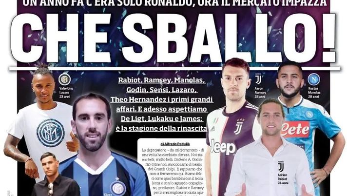 "Un anno fa c'era solo Ronaldo, ora il mercato impazza. Rabiot, Ramsey, Manolas, Godin, Sensi, Lazaro, Theo Hernandez i primi grandi affari. E adesso aspettiamo De Ligt, Lukaku e James: è la stagione della rinascita. 'Barella è della Roma'. Il presidente del Cagliari: 'Trovai l'accordo con l'Inter, poi è sparita. Fienga mi ha fatto una proposta eccellente che ho accettato. Al ragazzo ho dato 2 o 3 giorni per riflettere, l'ultima parola sarà di Nicolò'. Conte telefona al giocatore per non perderlo. Lazio, il colpo Lazzari. C'è l'intesa con la Spal: nove milioni più Murgia. Brasile, la sfida a Messi. Coppa America, semifinale (ore 2.30) con l'Argentina".