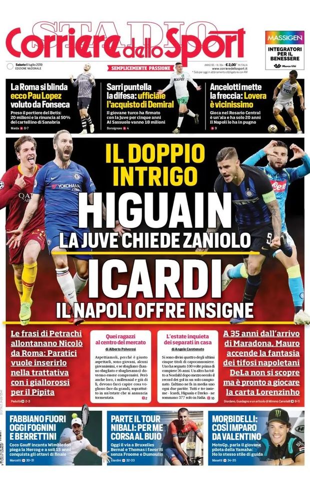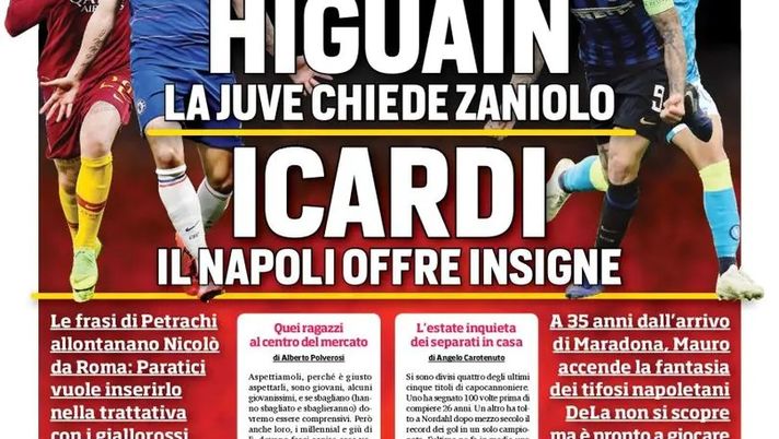 "Higuain, la Juve chiede Zaniolo. Icardi, il Napoli offre Insigne. Le frasi di Petrachi allontanano Nicolò da Roma: Paratici vuole inserirlo con i giallorossi per il Pipita. A 35 anni dall'arrivo di Maradona, Mauro accende la fantasia dei tifosi napoletani. DeLa non si scopre ma è pronto a giocare la carta Lorenzinho. La Roma si blinda, ecco Pau Lopez voluto da Fonseca. Preso il portiere del Betis: 20 milioni e la rinuncia al 50% del cartellino di Sanabria. Sarri puntella la difesa: ufficiale l'acquisto di Demiral. Il giovane turco ha firmato con la Juve per cinque anni. Al Sassuolo vanno 18 milioni. Ancelotti mette la freccia: Lovera è vicinissimo. Gioca nel Rosario Central, è un'ala e ha solo 20 anni: il Napoli lo ha in pugno".