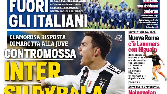 "Contromossa: clamorosa risposta di Marotta alla Juve. Paulo oggi incontra Sarri e per la prima volta apre ai nerazzurri. Paratici rientra da Londra e non vuole mollare Lukaku. La grana dei diritti d'immagine ceduti. Fuori gli italiani. Da Kean a Cutrone, la cessione all'estero dei talenti azzurri rappresenta un segnale negativo anche per Mancini. Galeone: 'Non abbiamo pazienza'. Il maestro di Allegri va controcorrente: diamo troppo in fretta l'etichetta di fenomeno a chi non lo è. Nuova Roma: c'è Lammers con Higuain, rivoluzione Fonseca. Non solo Dzeko, ma anche Schick ora è in vendita per far spazio all'olandese e al Pipita. E a Perugia Edin segna un gran gol, poi doppio Mancini. Nainggolan viola: il nodo è l'ingaggio. L'Inter lo ha proposto anche al club di Commisso ma allo stato attuale l'ingaggio di Radja (oltre 4,5 milioni) viene ritenuto insostenibile. Milinkovic, ora Lotito fa resistenza: ultimatum allo United. 'La Lazio non è costretta a vendere a tutti i costi'. Il patron sfida il Manchester: ci sono pochi giorni per chiudere l'operazione".