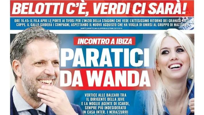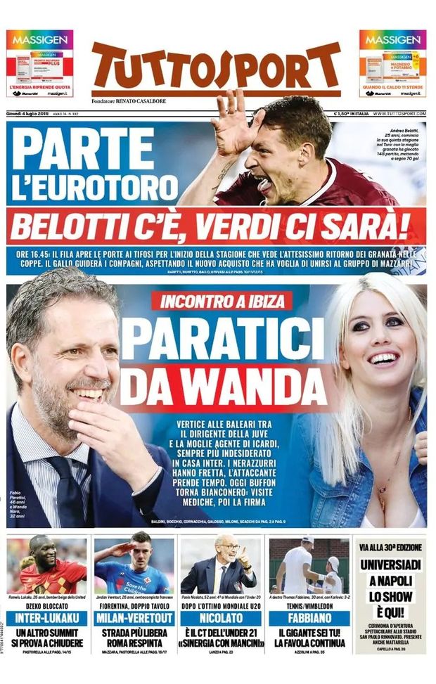 "Incontro a Ibiza. Vertice alle baleari tra il dirigente della Juve e la moglie agente di Icardi, sempre più indesiderato in casa Inter. I nerazzurri hanno fretta, l'attaccante prende tempo. Oggi Buffon torna bianconero: visite mediche, poi la firma. Parte l'EuroToro. Belotti c'è, Verdi ci sarà. Ore 16:45: il Fila apre le porte ai tifosi per l'inizio della stagione che vede l'attesissimo ritorno dei granata nelle coppe. Il Gallo guiderà i compagni, aspettando il nuovo acquisto che ha voglia di unirsi al gruppo di Mazzarri. Inter-Lukaku, un altro summit: si prova a chiudere, Dzeko bloccato. Milan-Veretout, Roma respinta e strada più libera: Fiorentina, doppio tavolo. Nicolato è il ct dell'Under 21 dopo l'ottimo Mondiale U20: 'Sinergia conMancini'".