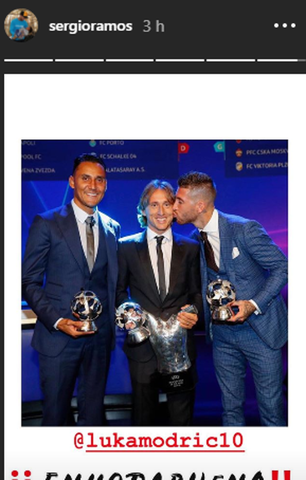 Il capitano dei blancos ha pubblicato una foto che ritrae i tre in posa con i trofei in mano e lui che bacia il centrocampista croato. D'impatto è sicuramente la didascalia che accompagna il fotogramma, con il difensore spagnolo che ha augurato al compagno la vittoria del trofeo più ambito da ogni calciatore: "E adesso, il Pallone d'Oro".