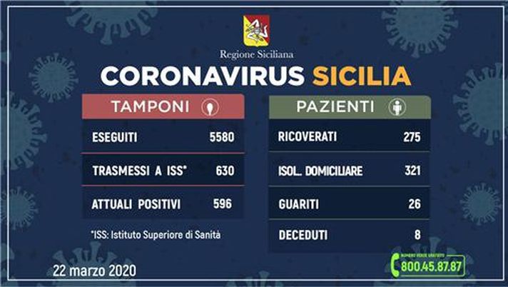 Sono al momento 596 le persone positive al Coronavirus nella Regione siciliana, 138 in più rispetto alla giornata di ieri. E' questo il quadro riepilogativo della situazione nell'Isola, aggiornato alle ore 12 di oggi (domenica 22 marzo). Come comunicato dalla Regione Siciliana all'Unità di crisi nazionale, dall'inizio dei controlli, i laboratori regionali di riferimento (Policlinici di Palermo e Catania) hanno analizzato 5.580 tamponi.