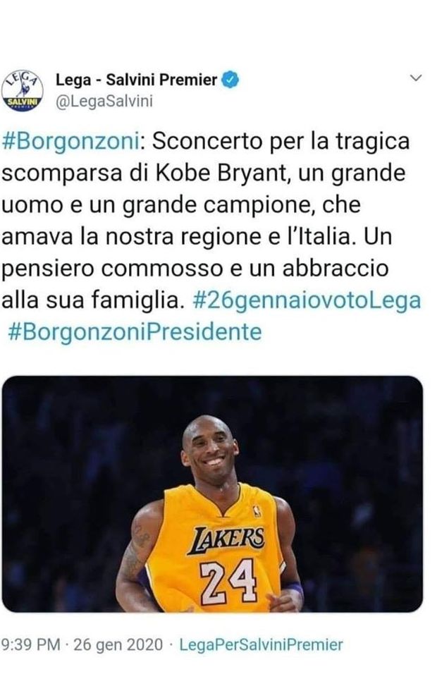Una gaffe dall'immediata risonanza mediatica, che la Lega ha cercato di risolvere pubblicando immediatamente le scuse e motivando così l'errore commesso: "È accaduto ciò: tutti i post di Lucia Borgonzoni in questi giorni venivano automaticamente rilanciati anche sui canali Lega con l’aggiunta, automatica, degli hashtag elettorali. Ciò ha riguardato anche il post di cordoglio per la scomparsa di Kobe Bryant e ce ne scusiamo".