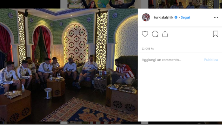 Lo sceicco ha pubblicato sul proprio profilo Instagram (che conta quasi due milioni di follower) immagini e video della serata: sullo sfondo si nota l'ambientazione tipica dell'Arabia Saudita, mentre in primo piano spiccano i giocatori dell'albiceleste con la tuta ufficiale della selezione argentina e il presidente con la tipica maglia a strisce rosse e bianche dell'Almeria.