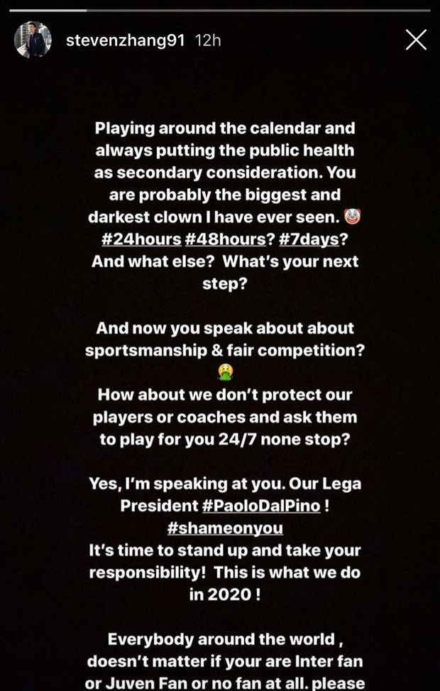 Il presidente del club nerazzurro, Steven Zhang, infatti, ha pesantemente insultato il presidente della Lega Serie A, Paolo Dal Pino, sul proprio account 'Instagram': "Sei il più grande clown che abbia mai visto. E tu parli di sportività, di campionato regolare? Cosa dici sul fatto che non proteggiamo i nostri giocatori e allenatori e chiedi loro di giocare 24 ore al giorno e 7 giorni su 7? Sto parlando proprio a te, al nostro presidente di Lega, vergognati. È ora di alzarsi e prendersi le proprie responsabilità, così bisogna fare nel 2020. Vale per tutti nel mondo, non importa se siete tifosi dell’Inter o della Juventus o non tifiate per nessuno. Per favore, state attenti alla vostra salute! È la cosa più importante per voi, per la vostra famiglia e per la nostra società".