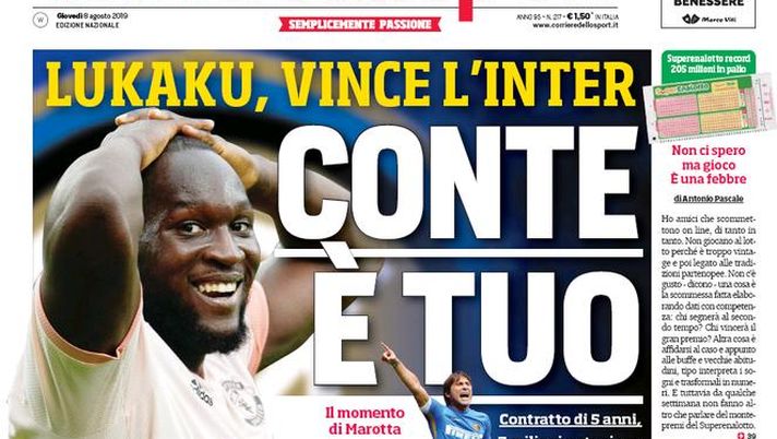 "Lukaku, vince l'Inter. Contratto di 5 anni, 7 milioni a stagione. Al Manchester United vanno 65 milioni più 10 di bonus. E' l'acquisto più caro nella storia nerazzurra. In nottata l'arrivo a Milano, oggi la firma. Poco Dzeko: la Roma non convince. Con il Bilbao l'attaccante entra solo nel finale: la cessione è pronta. Giallorossi salvi grazie a un rigore regalato: 2-2. Milinkovic, è allarme: lungo stop? La Lazio preoccupata, Sergej si è fermato per un infortunio: si teme una lesione. Oggi gli esami-verità. Napoli, adesso James. In attesa del sì di Lozano, De Laurentiis stringe per il colombiano ormai fuori da Real: Zidane non lo ha convocato".