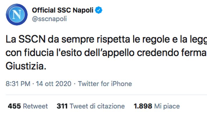 "La SSCN da sempre rispetta le regole e la legge. Attende con fiducia l'esito dell’appello credendo fermamente nella Giustizia", si legge sull'account social del Napoli.
