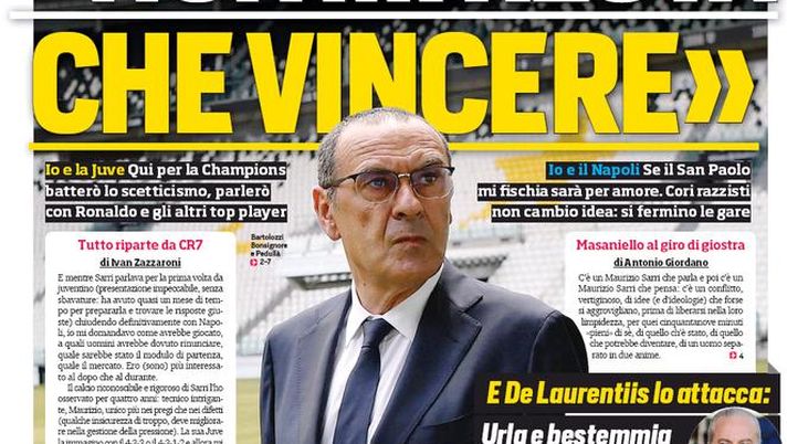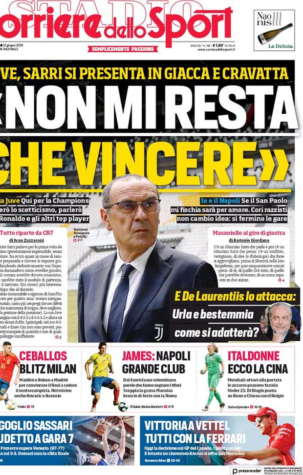 "Juve, Sarri si presenta in giacca e cravatta. 'Io e la Juve qui per la Champions, batterò lo scetticismo, parlerò con Ronaldo e gli altri top player. Io e il Napoli? Se il San Paolo mi fischia sarà per amore. Cori razzisti, non cambio idea: si fermino le gare. E De Laurentiis lo attacca: 'Urla e bestemmia, come si adatterà?'. Ceballos, blitz Milan. Maldini e Boban a Madrid per convincere il Real a cedere il centrocampista. Nel mirino anche Kovacic e Asensio. James: 'Napoli grande club'. Dal fuoriclasse colombiano parole che fanno sognare i tifosi. Scoppia la grana Manolas, braccio di ferro con la Roma. Italdonne, ecco la Cina. Mondiali: ottavi alla portata, le azzurre possono farcela. Under 21: Di Biagio punta su Kean e Chiesa con il Belgio".