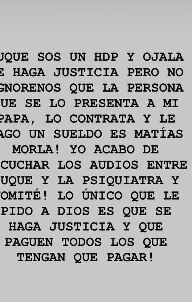"L'unica cosa che chiedo a Dio è che venga fatta giustizia e che paghino tutti coloro che devono pagare. Luque, sei un figlio di..., e speriamo sia fatta giustizia", ha detto la Dalma. Poi, l'ennesimo messaggio rivolto all'avvocato e presunto amico di Maradona, Matias Morla: "E non ignoriamo il fatto che la persona che lo presenta (Luque n.d.r.) a mio papà, lo ingaggia e poi lo paga è Matias Morla".