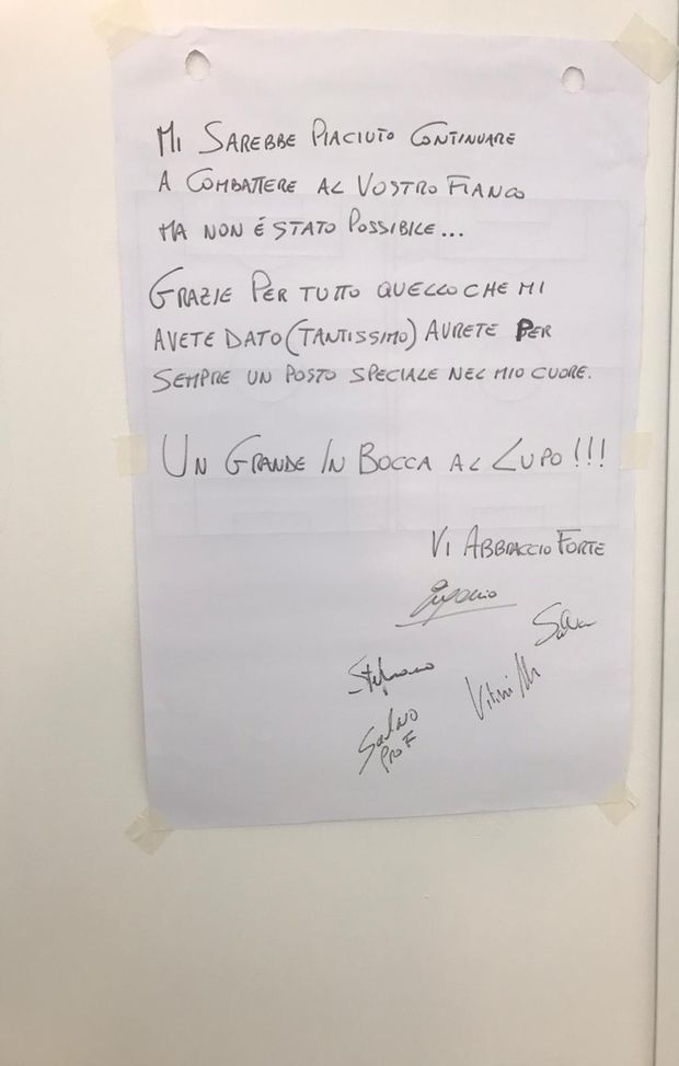 "Mi sarebbe piaciuto continuare a combattere al vostro fianco, ma non è stato possibile - ha scritto il classe '70 -. Grazie per tutto quello che mi avete dato (tantissimo), avrete per sempre un posto speciale nel mio cuore. Un grande in bocca al lupo! Vi abbraccio forte". Di seguito, la foto del messaggio in questione diffusa pochi istanti fa da "Sky Sport".