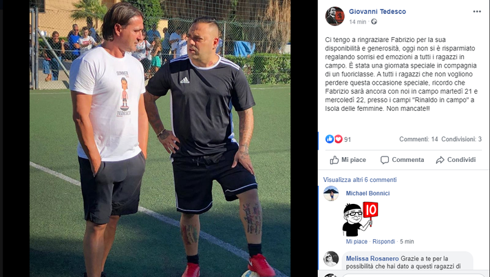 Attraverso un post su Facebook, Giovanni Tedesco ha ringraziato l'ex attaccante e capitano rosanero per avere risposto presente all'iniziativa: "Ci tengo a ringraziare Fabrizio per la sua disponibilità e generosità, oggi non si è risparmiato regalando sorrisi ed emozioni a tutti i ragazzi in campo. È stata una giornata speciale in compagnia di un fuoriclasse. A tutti i ragazzi che non vogliono perdere questa occasione speciale, ricordo che Fabrizio sarà ancora con noi in campo martedì 21 e mercoledì 22, presso i campi "Rinaldo in campo" a Isola delle femmine. Non mancate!", ha scritto.