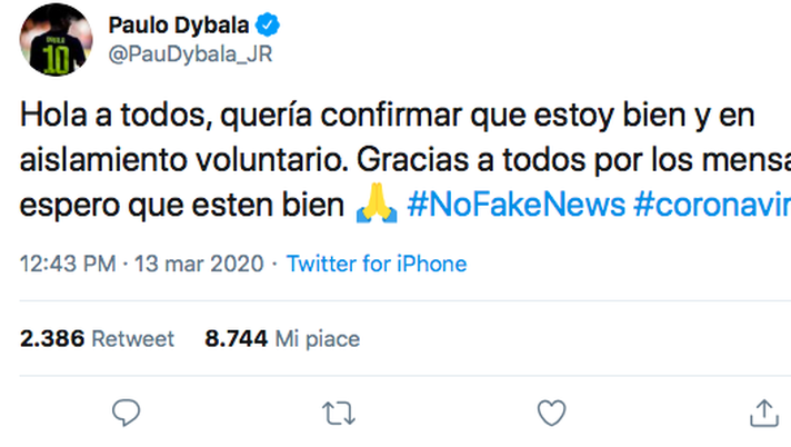 Il messaggio dell'ex Palermo, Paulo Dybala, a seguito della diffusione della notizia relativa ad una sua presunta positività al Coronavirus
