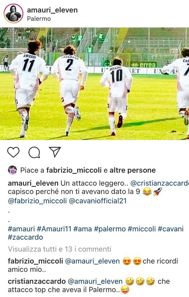 Ecco la foto in questione pubblicata su Instagram dall'ex attaccante del Palermo: in basso ci sono anche i commenti degli ex compagni. "Che ricordi amico mio!", scrive l'ex capitano Fabrizio Miccoli; "Che attacco top aveva il Palermo", aggiunge Zaccardo.