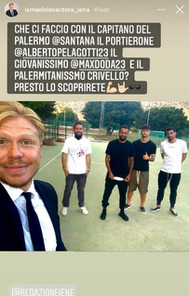 Il giornalista palermitano del noto programma "Le Iene" ha pubblicato una stories sul proprio profilo Instagram dove si mostra con alcuni calciatori del Palermo. Nello specifico, sono presenti nello scatto Mario Alberto Santana, Roberto Crivello, Alberto Pelagotti e Masimiliano Doda. "Che ci faccio con il capitano del Palermo Santana, il portierone Pelagotti, il giovanissimo Doda e il palermitanissimo Crivello? Presto lo scoprirete!", scrive su Instagram il giornalista del capoluogo siciliano.