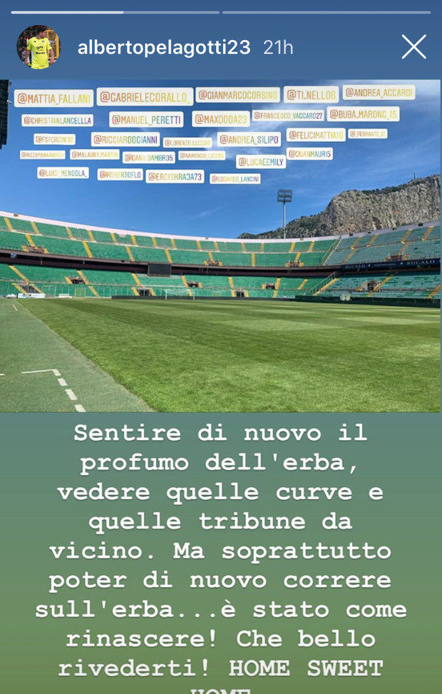 L’estremo difensore rosanero Alberto Pelagotti, attraverso una storia su Instagram, ha voluto testimoniare l’emozione vissuta, insieme ai compagni, al ritorno sul rettangolo verde: “Sentire di nuovo il profumo dell’erba, vedere quelle curve e quelle tribune da vicino. Ma soprattutto poter correre di nuovo sull’erba... È stato come rinascere! Che bello rivederti, home sweet home”, ha scritto.