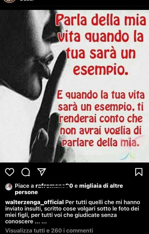Il racconto del giovane concorrente ha scaturito non poche polemiche e grande compartecipazione emotiva da parte dei compagni di avventura del ragazzo e degli ospiti in studio, che si sono subito schierati dalla parte di Zenga Junior. Tuttavia, l'ex tecnico del Cagliari non ha gradito i commenti sul suo conto, e questa mattina, attraverso il proprio account Instagram, non le ha mandate a dire a chi lo ha additato ed etichettato come un cattivo padre: “Parla della mia vita quando la tua sarà un esempio. E quando la tua vita sarà un esempio, ti renderai conto che non avrai voglia di parlare della mia. Per tutti quelli che mi hanno inviato insulti, scritto cose volgari sotto le foto dei miei figli, per tutti voi che giudicate senza conoscere”.