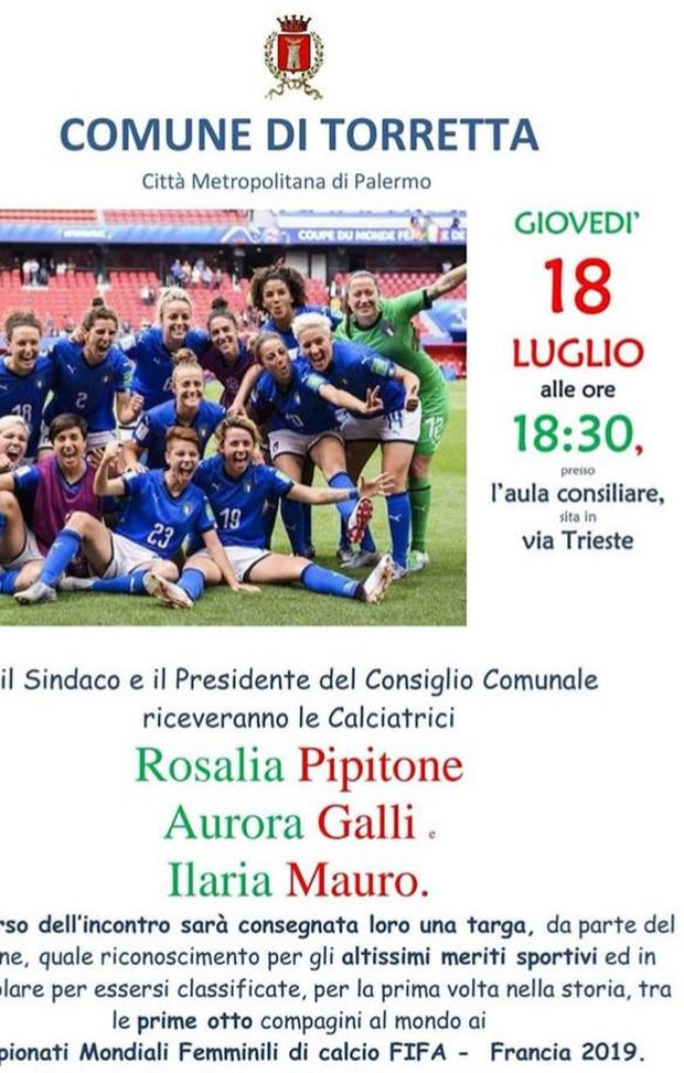 Il Sindaco e il Presidente del Consiglio Comunale riceveranno Rosalia Pipitone, Aurora Galli e Ilaria Mauro. Proprio il secondo portiere dell'Italia, che attualmente milita nella Roma, è originaria del comune in provincia di Palermo, mentre le altre due, che vestono rispettivamente le maglie di Juventus e Fiorentina, sono nate a Tromello e Gemona del Friuli. Nel corso dell'incontro sarà consegnata loro una targa come riconoscimento per i meriti sportivi conquistati in occasione del Mondiale di Francia 2019, dove sono arrivate ai quarti di finale venendo eliminate dall'Olanda. Le ragazze di Milena Bertolini si sono così classificate per la prima volta nella storia tra le prime otto compagini al mondo.