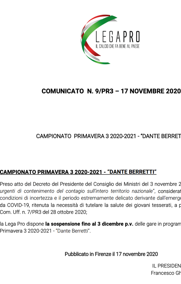 "Preso atto del Decreto del Presidente del Consiglio dei Ministri del 3 novembre 2020 recante “Misure urgenti di contenimento del contagio sull’intero territorio nazionale”, considerato il perdurare delle condizioni di incertezza e il periodo estremamente delicato derivante dall’emergenza epidemiologica da COVID-19, ritenuta la necessità di tutelare la salute dei giovani tesserati, a parziale modifica del Com. Uff. n. 7/PR3 del 28 ottobre 2020; la Lega Pro dispone la sospensione fino al 3 dicembre p.v. delle gare in programma del Campionato Primavera 3 2020-2021 - “Dante Berretti”.