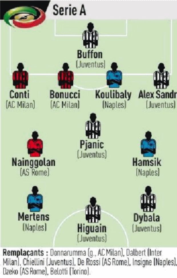 Nonostante il dominio juventino delle ultime 6 stagioni di Serie A l'Equipe non premia la squadra che ha sfiorato il triplete nella scorsa stagione, limitando i selezionati a 5. Le nomination per il Napoli sono 3, il Milan si ferma a 2, mentre Nainggolan è l'unico giallorosso della squadra. Dybala e Higuain davanti fanno compagnia a Mertens, solo panchina per Icardi, Insigne, Dzeko e Belotti.