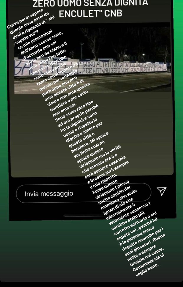 "Curva Nord, sapete quante cose avrei da dirvi riguardo di chi sapete voi? (Il riferimento è il presidente Cellino, ndr). Le mie prestazioni dell’anno scorso, sono d’accordo con voi, non sono state da Mario e il mea culpa l’ho fatto ma posso dirvi che sono state anche tanto condizionate da questo personaggio purtroppo che non ama questa città e di sicuro non ama questa bandiera e per certo non ama voi. Sono stato zitto fino ad ora – prosegue Balo su Instagraml – perchè ho la dignità e sono uomo e rispetto la dignità e l’amore per questa città e per questa bandiera. Mi spiace sia finita così, mi spiace questo striscione ma la verità che Brescia era ed è sempre casa mia e Brescia avrà sempre il mio rispetto. Forse questo striscione posso anche capirlo dal momento che siete ignari di ciò che internamente è veramente successo – sarebbe stato più corretto scriverlo a chi sapete voi. Perchè lui è la persona senza rispetto neanche per i suoi calciatori. Buona notte e sempre Brescia nel cuore. Comunque sia, vi voglio bene", si legge.