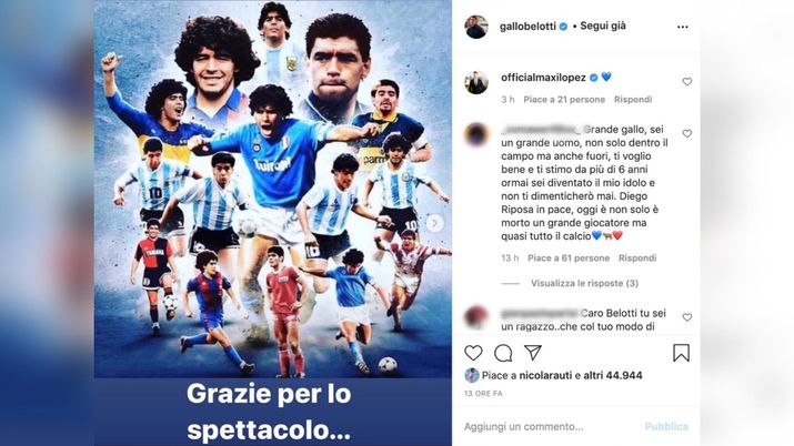 "Diversi, infatti, sono stati i messaggi di cordoglio diffusi attraverso i più popolari social per ricordare Maradona. Tra questi, anche il 'Gallo' del TorinoAndrea Belotti, che su Instagram ha voluto ricordare e celebrare El Pibe de Oro con parole semplici ma dirette: "Grazie per lo spettacolo...il più grande spettacolo".