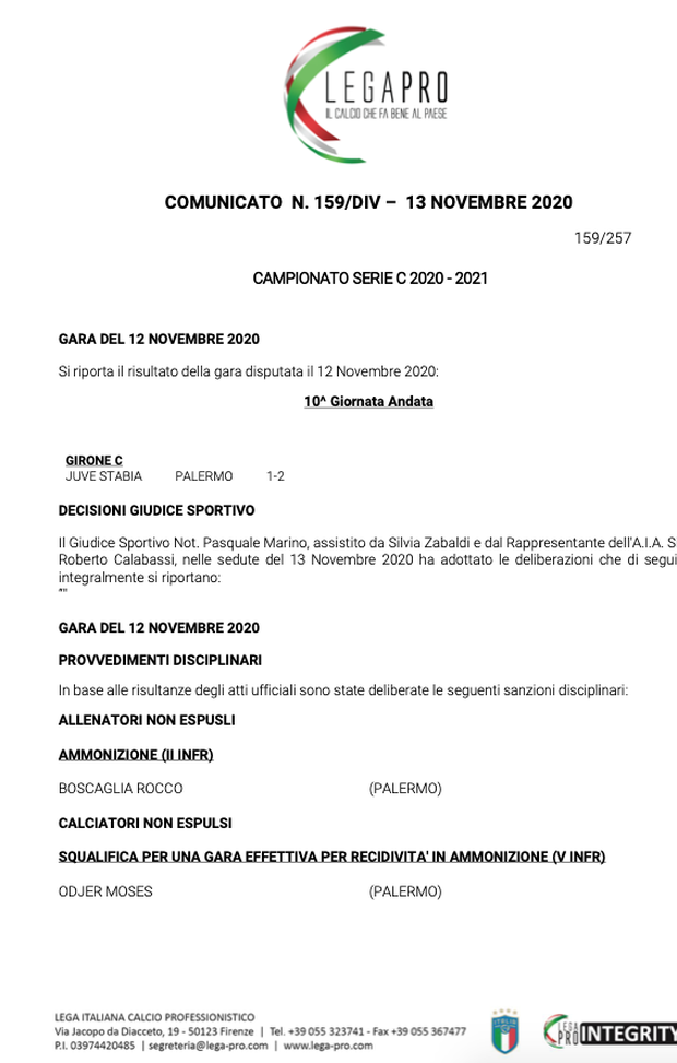Il Giudice Sportivo Not. Pasquale Marino, assistito da Silvia Zabaldi e dal Rappresentante dell'A.I.A. Sig. Roberto Calabassi, nelle sedute del 13 Novembre 2020 ha adottato le deliberazioni che di seguito integralmente si riportano: