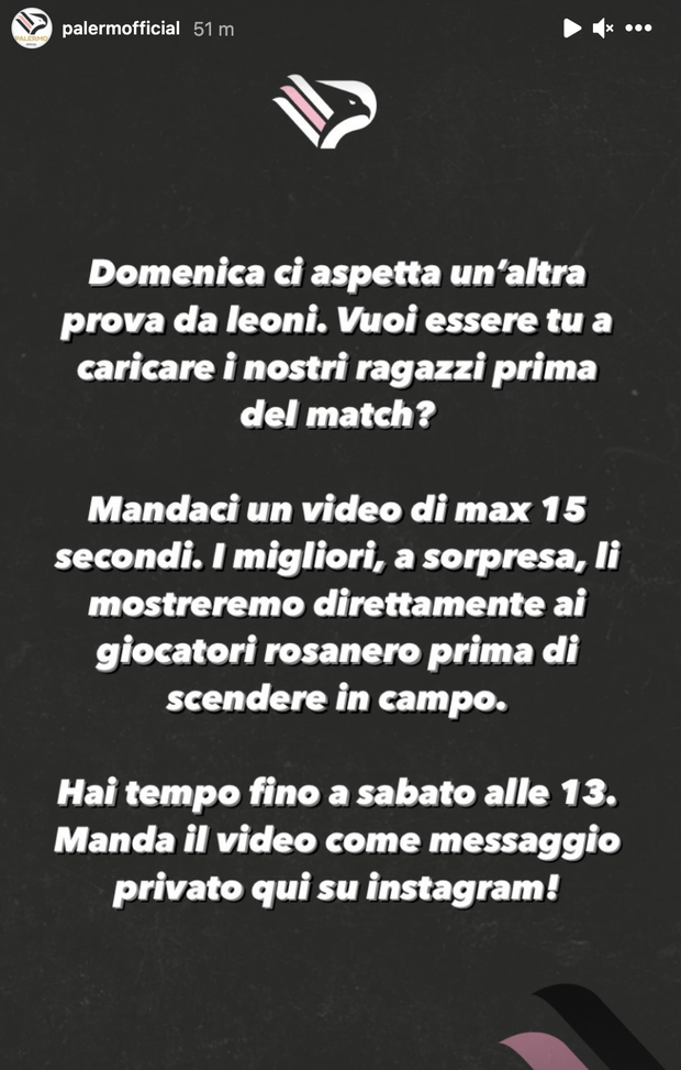 Basterà inviare un video motivazionale di soli 15 secondi, indirizzato a tutta la squadra in vista di tale importante appuntamento. Entro sabato alle ore 13 - vigilia della gara d'andata al Renzo Barbera - potranno essere recapitate le stories taggando direttamente il canale Instgram ufficiale del Palermo, con i migliori che verranno mostrati all'intero gruppo squadra poco prima dell'ingresso in campo.