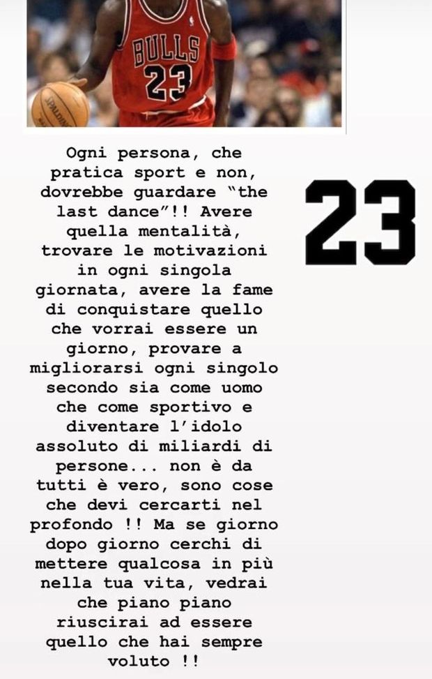 "Nel frattempo, il numero uno rosanero, Alberto Pelagotti, su Instagram, si è lasciato andare ad uno sfogo motivazionale per se stesso e per i suoi compagni: "Ogni persona, che pratica sport e non, dovrebbe guardare "The Last Dance"!! Avere quella mentalità, trovare le motivazioni in ogni singola giornata, avere la fame di conquistare quello che vorrai essere un giorno, provare a migliorarsi ogni singolo secondo sia come uomo che come sportivo e diventare l'idolo assoluto di miliardi di persone. Non è da tutti è vero, sono cose che devi cercarti nel profondo!! Ma se giorno dopo giorno cerchi di mettere qualcosa in più nella vita, vedrai che piano piano riuscirai ad essere quello che hai sempre voluto!".