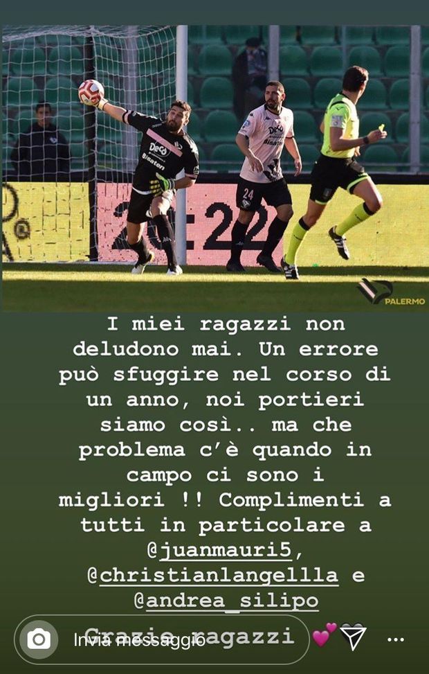 Il nuovo Palermo apre con una vittoria il girone di ritorno: Alberto Pelagotti si gode la vittoria e suona la carica su Instagram