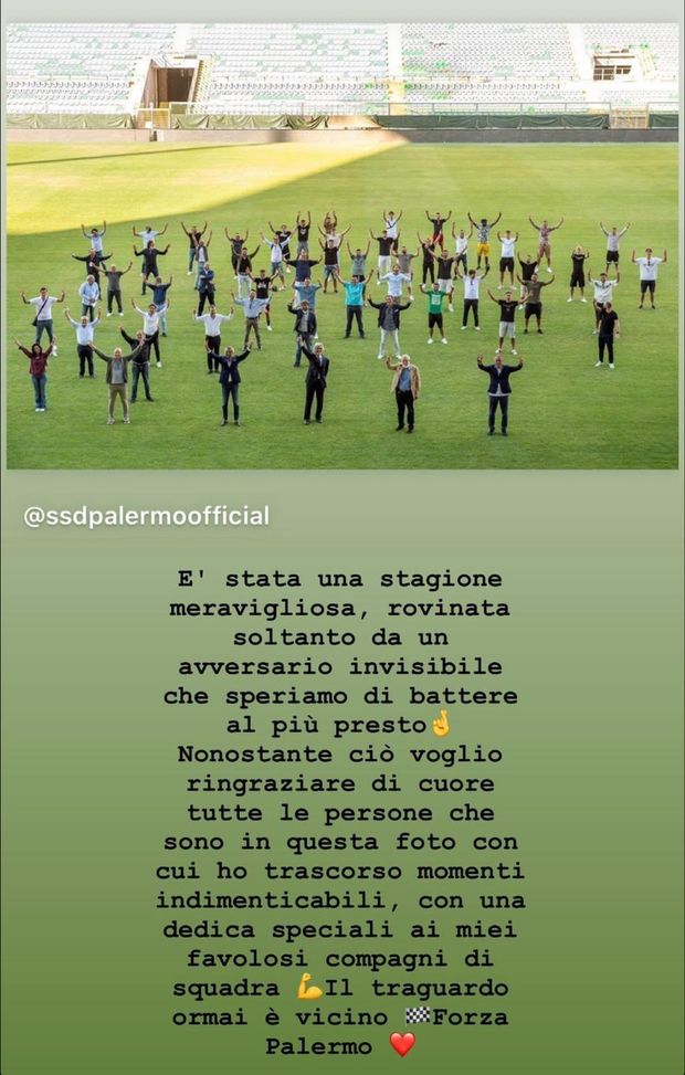 "È stata una stagione meravigliosa, rovinata soltanto da un avversario invisibile che speriamo di battere al più presto. Nonostante ciò, voglio ringraziare di cuore tutte le persone che sono in questa foto con cui ho trascorso momenti indimenticabili, con una dedica speciale ai miei favolosi compagni di squadra. Il traguardo ormai è vicino. Forza Palermo".