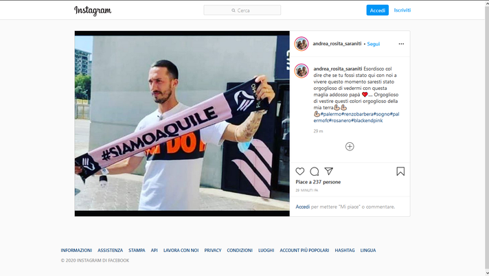 Andrea Saraniti condivide la gioia sui social per il trasferimento al Palermo