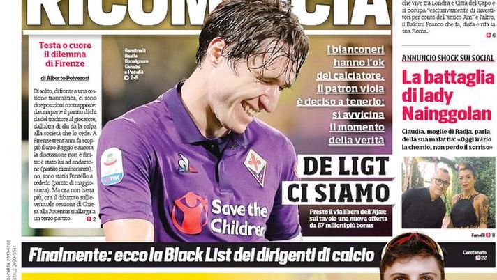 "Federico potrebbe rompere con Commisso. I bianconeri hanno l'ok del calciatore, il patron viola è deciso a tenerlo: si avvicina il momento della verità. De Ligt, ci siamo. Presto il via libera dell'Ajax: sul tavolo una nuova offerta da 67 milioni più bonus. Inter, Barella è tuo. Al Cagliari 45 milioni più 4 di bonus 'difficili'. Oggi le visite mediche. Ma Lukaku diventa inaccessibile: lo United è salito a 85. Alderweireld, la Roma dagli Spurs: trattativa caldissima. Baldini incontra Levy per il difensore belga (clausola da 28 milioni). Si riparla anche di Zaniolo se parte Eriksen. La battaglia di Lady Nainggolan: annuncio shock sui social. Claudia, moglie di Radja, parla della sua malattia: 'Oggi inizio la chemio, non perdo il sorriso'. Finalmente: ecco la black list dei dirigenti di calcio".
