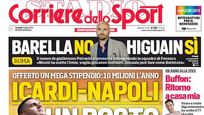 "Offerto un mega stipendio: 10 milioni l'anno. L'Inter deve cederlo per arrivare a Lukaku, DeLa lo corteggia ma attende le mosse della Juve prima di tentare l'affondo. Barella no, Higuain sì. Il nuovo ds giallorosso, Petrachi, si presenta ridisegnando la squadra di Fonseca: 'Nicolò ha scelto l'Inter, voglio giocatori motivati. Gonzalo può fare come Batistuta'. Buffon: 'Ritorno a casa mia', un anno alla Juve. Firme e visite, Gigi entusiasta ha scelto il 77: 'La vita è incredibile e finalmente giocherò con Ronaldo'. 'A Chiesa ci penso io'. Firenze, Pradè s'insedia e blinda il gioiello viola. 'Campionesse siete solo voi'. Mattarella alle azzurre: 'No a disparità tra il calcio maschile e quello femminile'".