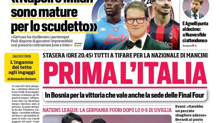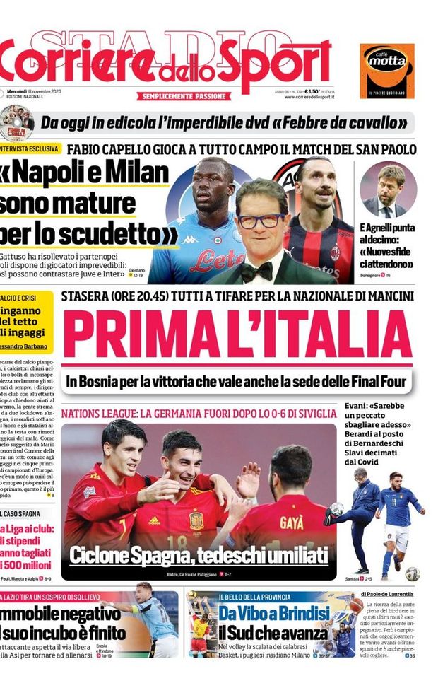 Mediagol.it vi propone la prima pagina del “Corriere dello Sport" oggi in edicola. “Fabio Capello gioca a tutto campo il match del San Paolo: Napoli e Milan mature per lo Scudetto”, “Prima l’Italia, in Bosnia per la vittoria che vale le Final Four”, “Nations League: la Germania fuori dopo lo 0-6 d Siviglia”, “Ciclone Spagna, tedeschi umiliati”, “Immobile nativo, il suo incubo è finito”.