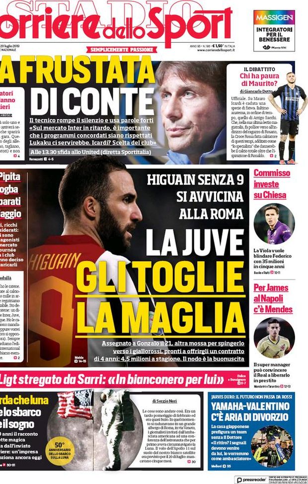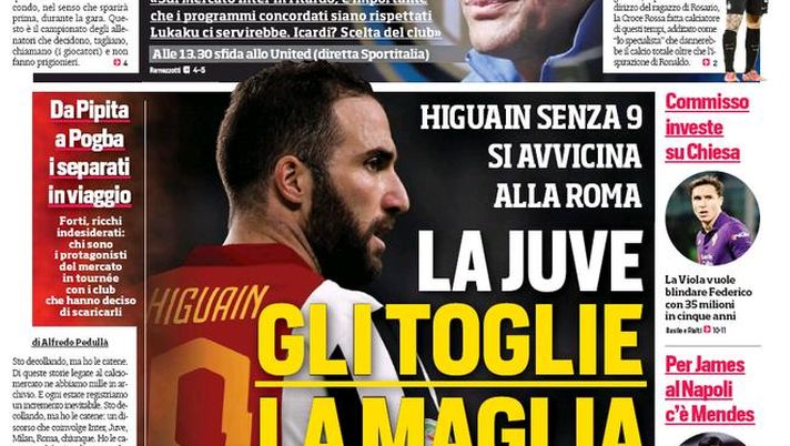 "Higuain senza 9, si avvicina la Roma. Assegnato a Gonzalo il 21, altra mossa per spingerlo verso i giallorossi, pronti a offrirgli un contratto di 4 anni: 4,5 milioni a stagione. Il nodo è la buonuscita. De Ligt stregato da Sarri: 'In bianconero per lui'. Da Pipita a Pogba, i separati in viaggio. Forti, ricchi, indesiderati: chi sono i protagonisti del mercato in tournée con i club che hanno deciso di scaricarli. La frustata di Conte. Il tecnico rompe il silenzio e usa parole forti: 'Sul mercato Inter in ritardo, è importante che i programmi concordati siano rispettati. Lukaku ci servirebbe. Icardi? Scelta del club'. Alle 13.30 sfida allo United (diretta Sportitalia). Commisso investe su Chiesa. La Viola vuole blindare Federico con 35 milioni in cinque anni. Per James al Napoli c'è Mendes. Il super manager può convincere il Real a liberarlo in prestito".