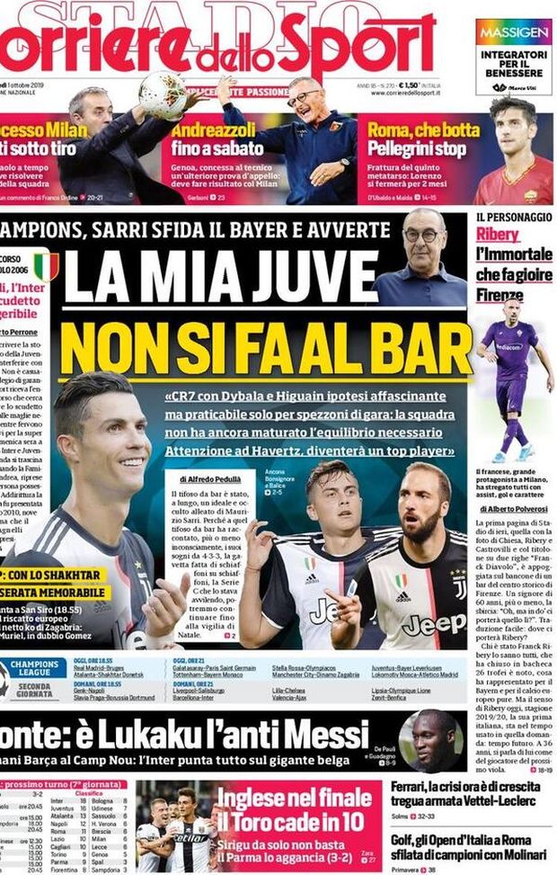 "Champions, Sarri sfida il Bayern e avverte: 'CR7 con Dybala e Higuain ipotesi affascinante ma praticabile solo per spezzoni di gara: la squadra non ha ancora maturato l'equilibrio necessario. Attenzione ad Havertz, diventerà un top player'. Gasp: con lo Shakhtar una serata memorabile. L'Atalanta a San Siro (18.55) cerca il riscatto europeo dopo il netto ko di Zagabria: torna Muriel, in dubbio Gomez. Processo Milan, tutti sotto tiro. Giampaolo a tempo ma deve risolvere i guai della squadra. Andreazzoli fino a sabato. Genoa, concessa al tecnico un'ulteriore prova d'appello: deve fare risultato col Milan. Roma, che botta. Pellegrini stop. Frattura del quinto metatarso: Lorenzo si fermerà per 2 mesi. Ribery l'immortale che fa gioire Firenze. Il francese, grande protagonista a Milano, ha stregato tutti con assist, gol e carattere. Conte: è Lukaku l'anti Messi. Domani Barça al Camp Nou: l'Inter punta tutto sul gigante belga. Inglese nel finale, il Toro cade in 10. Sirigu da solo non basta, il Parma lo aggancia (3-2)".