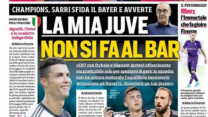 "La mia Juve non si fa al bar". Apre così l’edizione odierna de 'Il Corriere dello Sport'.