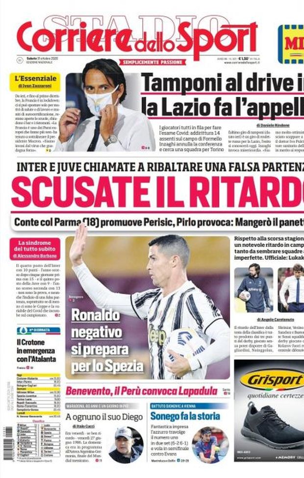 Apre così l'edizione la prima pagina dell'edizione odierna del "Corriere dello Sport", oggi in edicola. "Inter e Juve chiamate a ribaltare una falsa partenza. Conte col Parma promuove Perisic, Pirlo provoca: Mangerò il panettone". Spazio ancora alla Juventus: "Ronaldo negativo si prepara per lo Spezia", si legge. In taglio alto: "Tamponi al drive in, la Lazio fa l'appello". Di spalla: "Il Crotone in emergenza con l'Atalanta", mentre in taglio basso: "Benevento, il Perù convoca Lapadula".