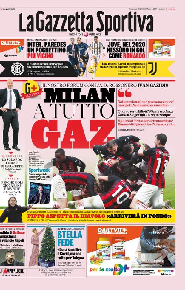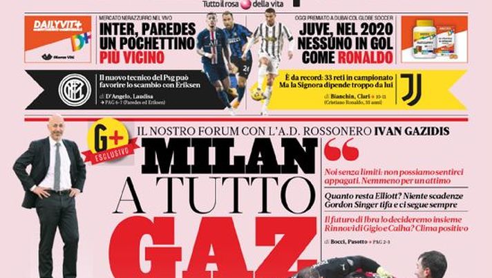 Prima Pagina, Gazzetta dello Sport: “Milan, a tutto Gaz. Juve, nel 2020 nessun gol come CR7″