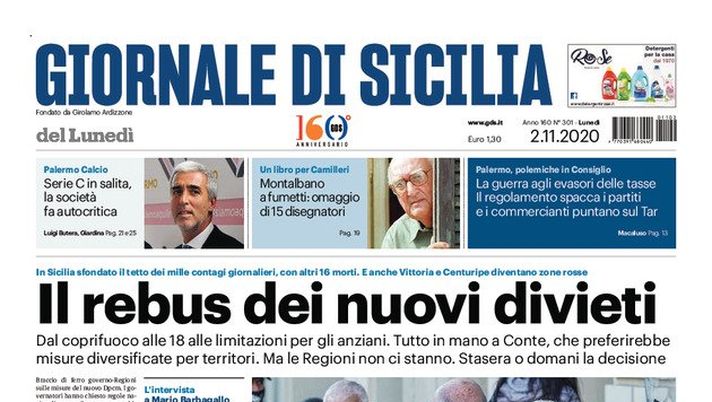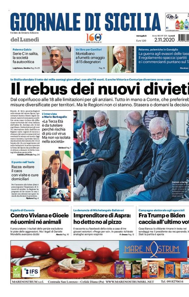 Apre così la prima pagina dell'edizione odierna del 'Giornale di Sicilia', oggi in edicola. “In Sicilia sfondato il tetto dei mille contagi giornalieri, con altri 16 morti. E anche Vittoria e Centuripe diventano zone rosse”; “Mario Barbagallo: «La testa età è da tutelare perché rischia di più col virus. Ma non va isolata nella società»”; “Razza: evitare il caos con visite e cure domiciliari”; “Il giallo di Caronia: contro Viviana e Gioele né uomini né animali”; “Imprenditore di Aspra: ho detto no al picco”; “Fra Trump e Biden, caccia all’ultimo voto”. Spazio al Palermo calcio, “Serie C in salita, la società fa autocritica”
