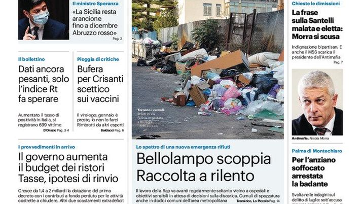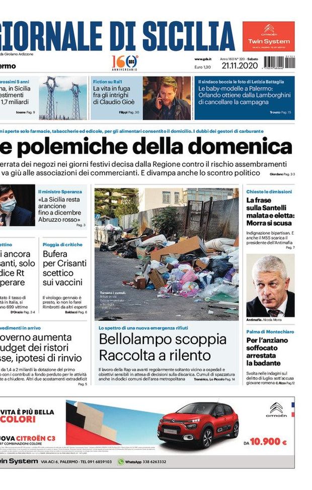 Apre così la prima pagina dell’edizione odierna del ‘Giornale di Sicilia’. “La serrata dei negozi nei giorni festivi decisa dalla Regione contro il rischio assembramenti non va giù alle associazioni dei commercianti. E divampa anche lo scontro politico. Il ministro Speranza: ‘La Sicilia resta arancione fino a dicembre. Abruzzo rosso’. Dati ancora pesanti, solo l’indice Rt fa sperare. Bufera per Crisanti scettico sui vaccini. Il governo aumenta il budget dei ristori. Tasse, ipotesi di rinvio”. E ancora: “Bellolampo scoppia, raccolta a rilento. La frase sulla Santelli malata e eletta: Morra si scusa. Per l’anziano soffocato arrestata la badante”. Infine, in taglio alto: Terna, in Sicilia investimenti per 1,7 miliardi. La vita in fuga fra gli intrighi di Claudio Gioè. Le baby-modelle a Palermo: Orlando ottiene dalla Lamborghini di cancellare la campagna”.