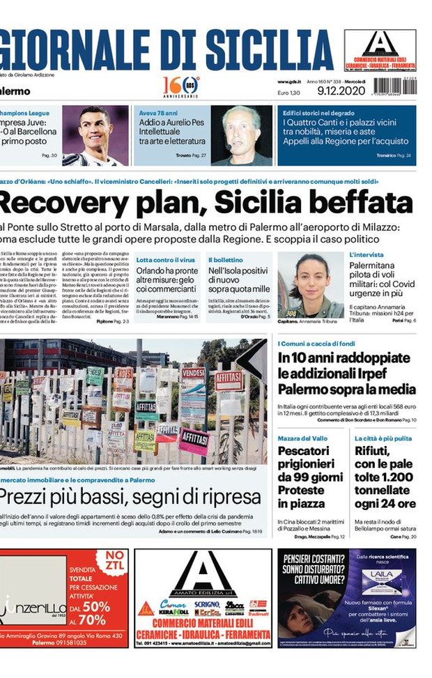 Prima Pagina, Giornale di Sicilia: “Recovery plan, Sicilia beffata! Covid, Orlando ha pronte altra misure”