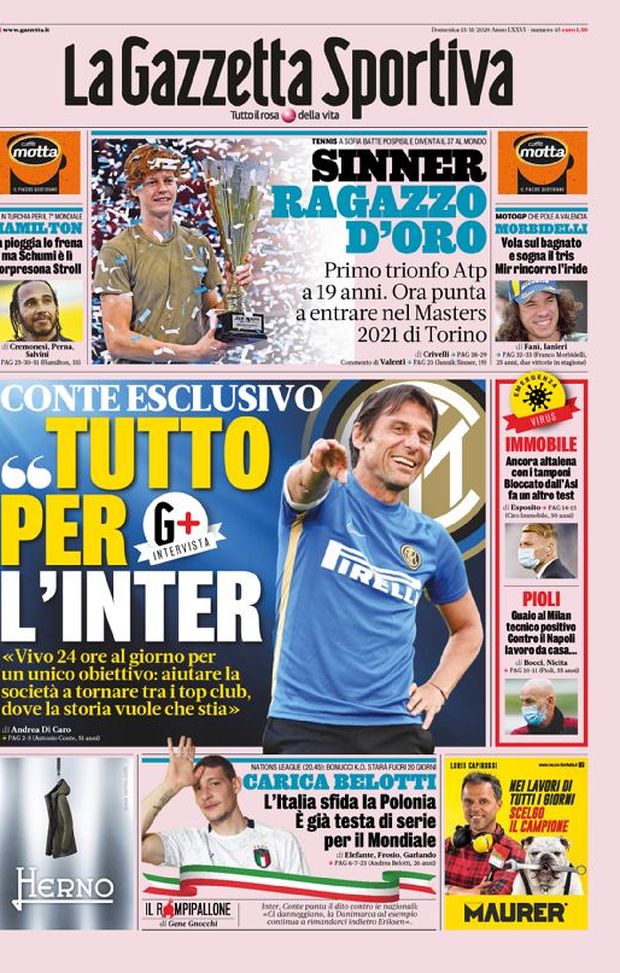 Apre così l’edizione odierna de “La Gazzetta dello Sport”. “Conte: «Vivo 24 ore al giorno per unico obiettivo: aiutare la società a tornare tra i top club, dove la storia vuole che stia»”. “Carica Belotti, l’Italia sfida la Polonia. È già testa di serie per il Mondiale. Nations League (20.45): Bonucci ko, starà fuori 20 giorni”.