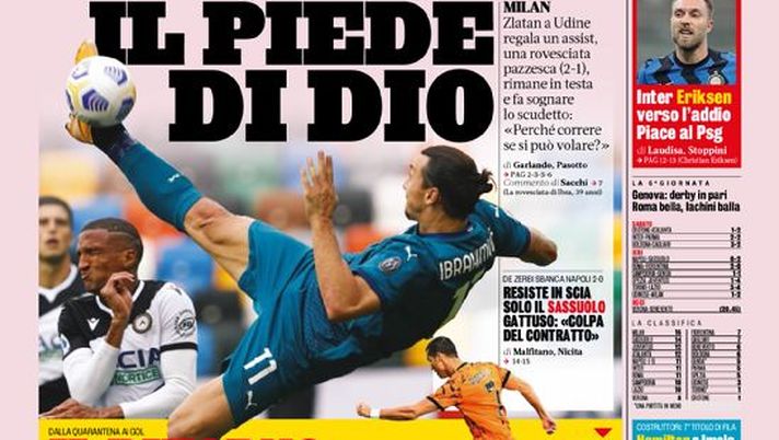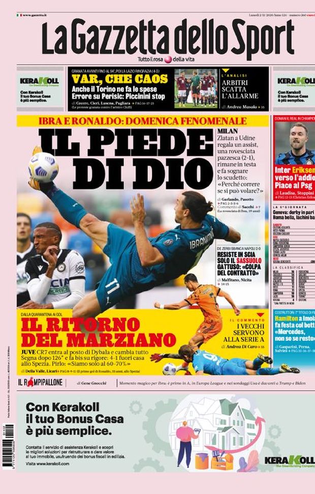 "Apre così la prima pagina dell'edizione odierna de 'La Gazzetta dello Sport', oggi in edicola. “Var che caso”; “Arbitri, scatta l’allarme”; Ibra e Ronaldo: Domenica fenomenale”; “Il ritorno del marziano. I vecchi servono alla Serie A”; “Resiste in scia solo il Sassuolo. Gattuso: «Colpa del contratto»”; “Inter, Eriksen verso l’addio. Piace al PSG”; “Genova derby in pari. Roma bella, Iachini balla”; E infine, spazio alla Formula 1, “Hamilton a Imola fa festa col botto «Mercedes non so se resisto»”.