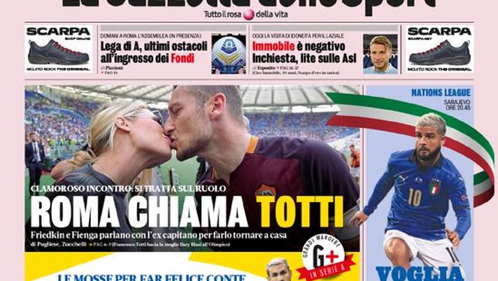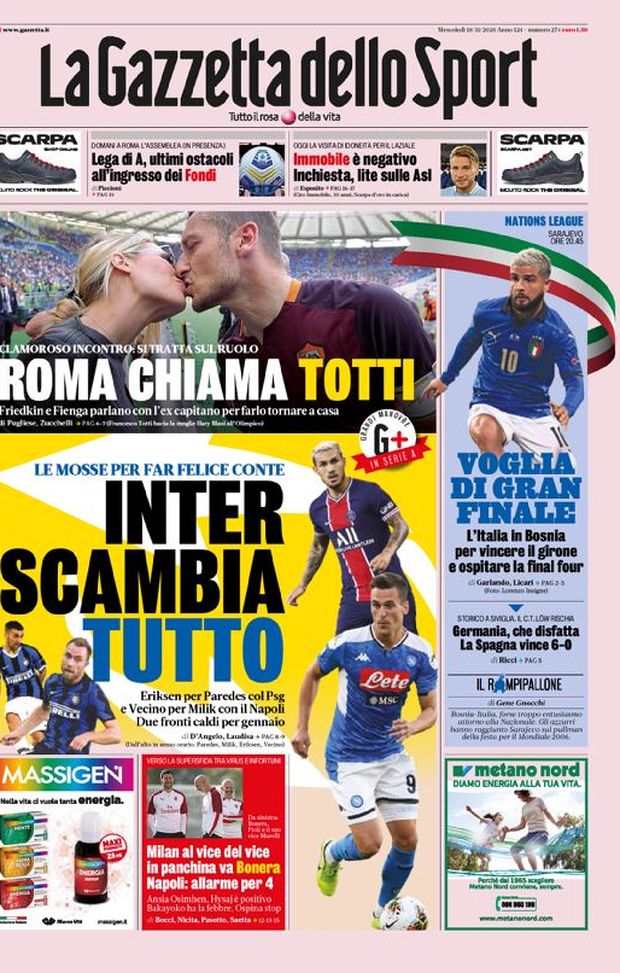 Mediagol.it vi propone la prima pagina de “La Gazzetta dello Sport" oggi in edicola. “Roma chiama Totti”, “Inter scambia tutto”, “Voglia di gran finale”, “Italia in Bosnia per vincere il girone e ospitare le final four”, “Germania, che disfatta. La Spagna vince 6-0”.