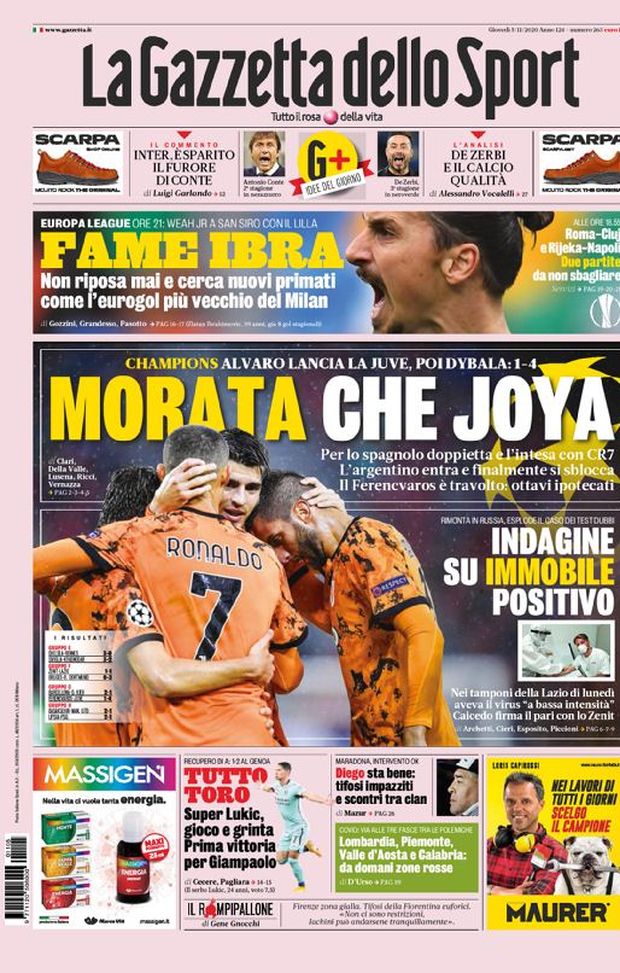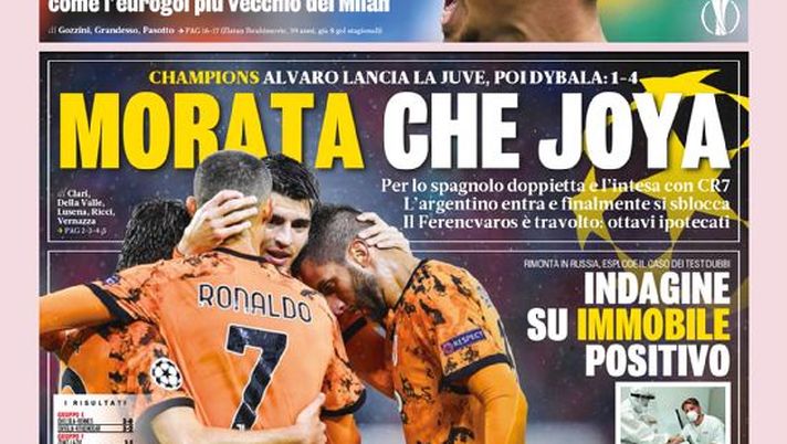 Apre così la prima pagina de “La Gazzetta dello Sport”, oggi in edicola. “Alvaro lancia la Juve, poi Dybala. Per lo spagnolo doppietta e l’intesa con CR7. L’argentino entra e finalmente si sblocca. Il Ferenevaros è travolto: ottavi ipotecati. Indagine su Immobile positivo. Nei tamponi della Lazio di lunedì aveva il virus ‘a bassa intensità’. Caicedo firma il pari con lo Zenit”. In taglio alto, riflettori puntati in casa Milan: “Fame Ibra. Non riposa mai e cerca nuovi primati come l’eurogol più vecchio del Milan. Roma-Cluj e Rijeka-Napoli, due partite da non sbagliare”. Infine, in taglio basso: “Tutto Toro. Super Lukic, gioco e grinta. Prima vittoria per Giampaolo. Maradona, intervento ok. Diego sta bene: tifosi impazziti e scontri tra clan”.